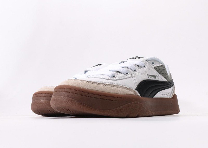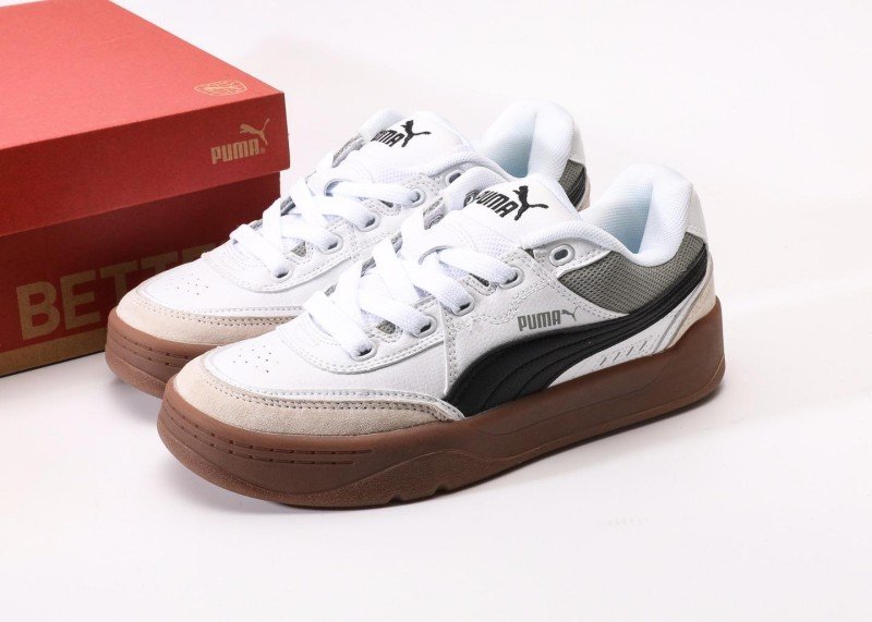 PUMA Slipstream Lo Laces features white-gray-brown colorblock, white leather upper with gray mesh panels, black streamlined stripes, anti-slip brown rubber outsole, 1:1 official packaging.