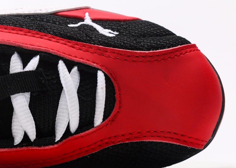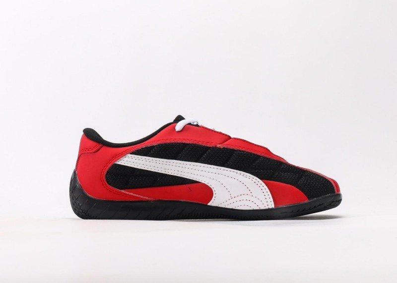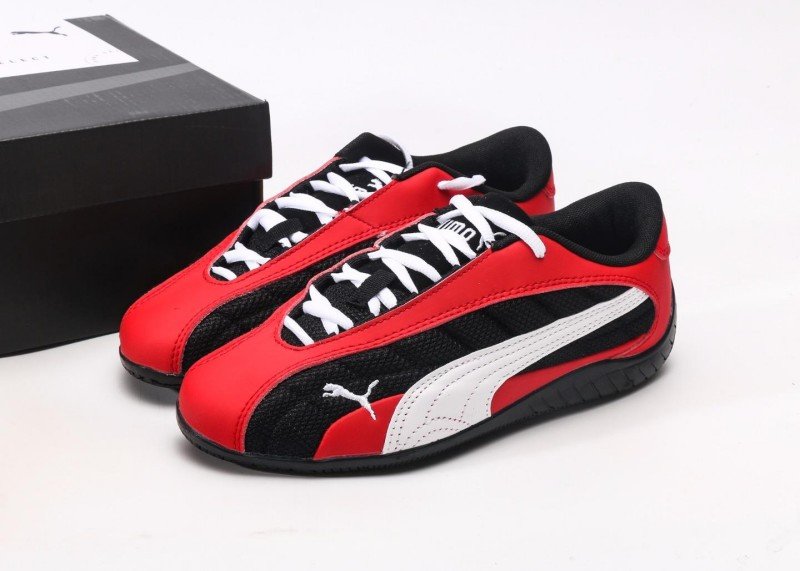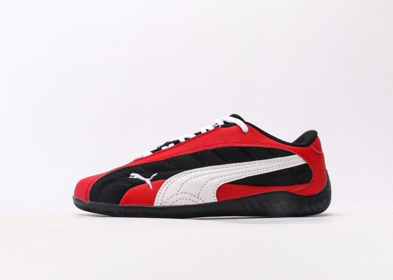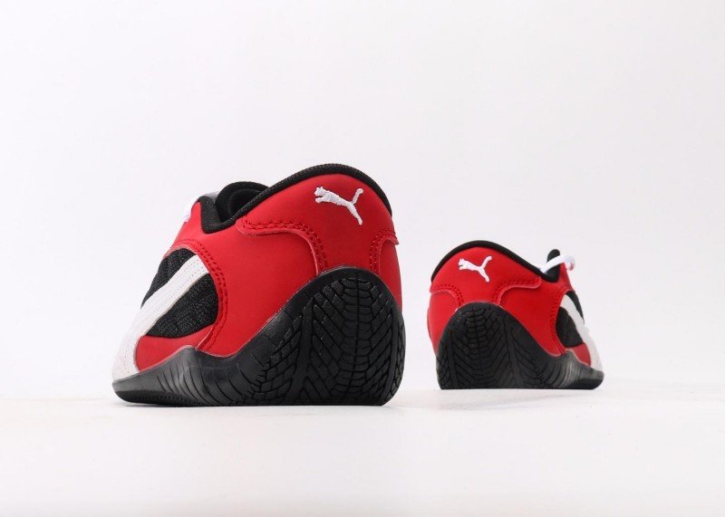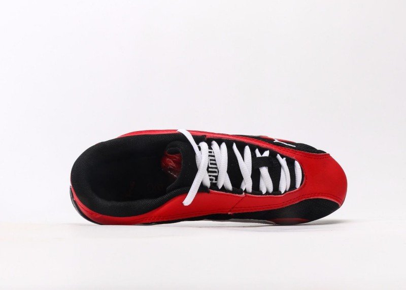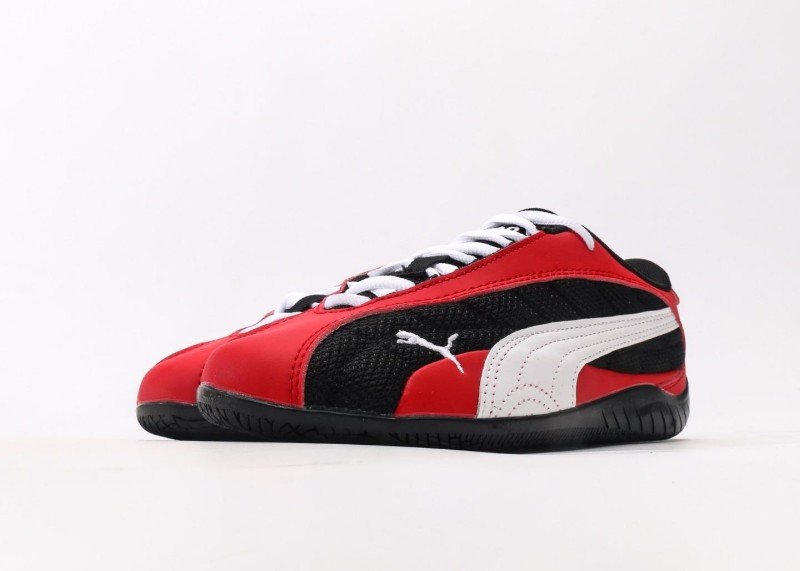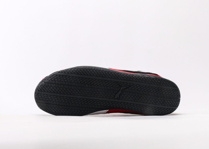 Puma Speedcet OG x BALENCIAGA features red-white-black suede colorblock, red suede upper with white racing stripes, black PUMA logo, anti-slip rubber outsole, 1:1 official packaging.