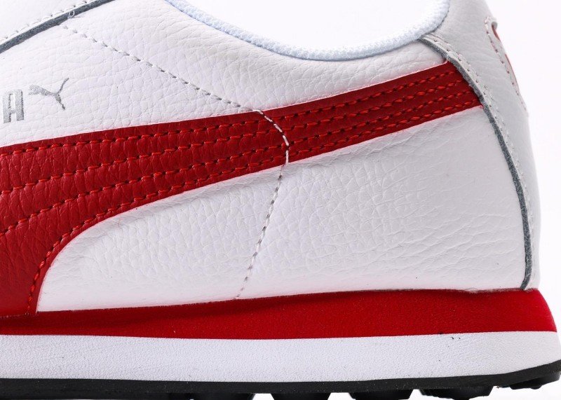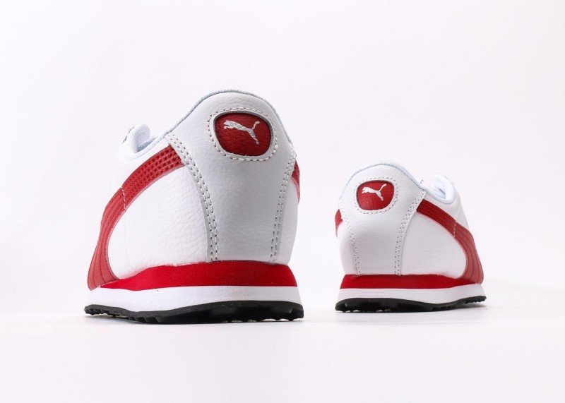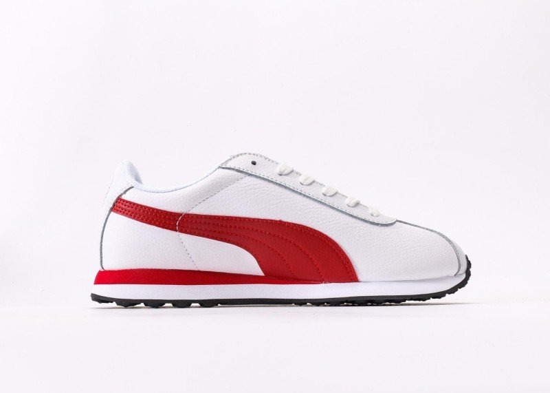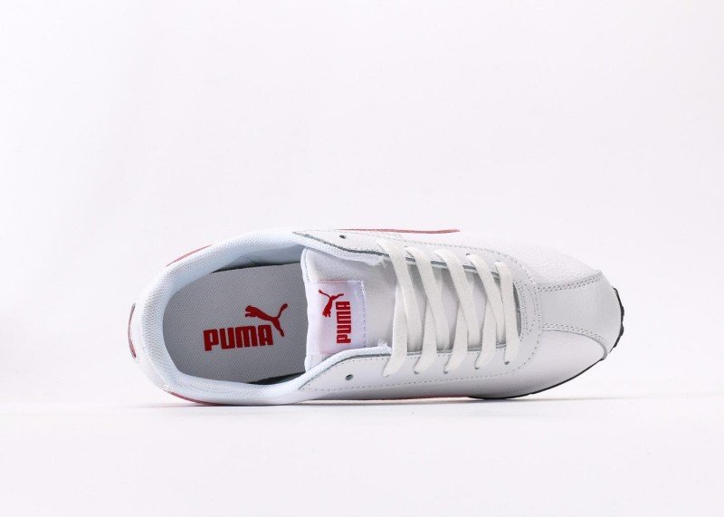 PUMA TURINO II OG features white-red-black colorblock, white leather upper with red streamlined stripes, black rubber outsole, silver PUMA logo, Softfoam memory insole, 1:1 official packaging.