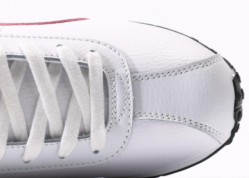 Premium white leather with red stripe detail, black outsole for durability, silver branding, EVA midsole cushioning, rubber traction pattern, identical to counter specifications.