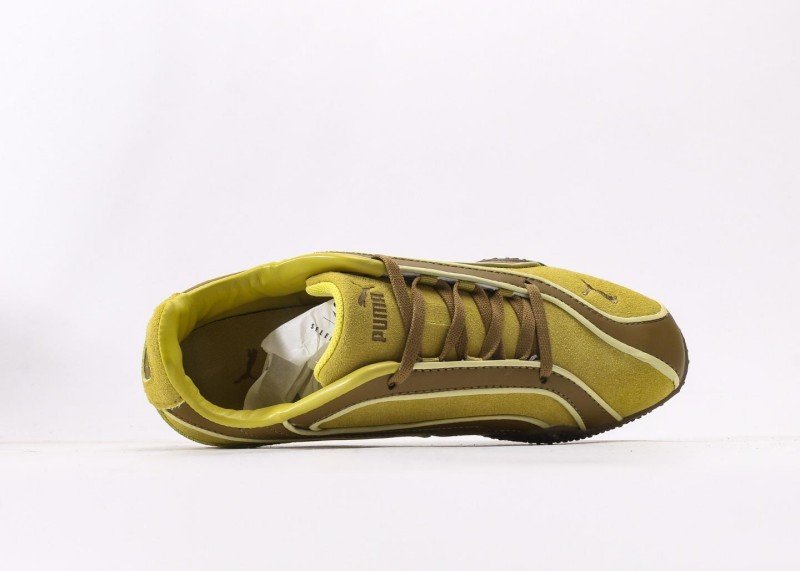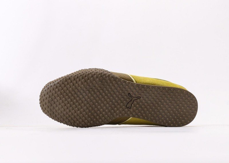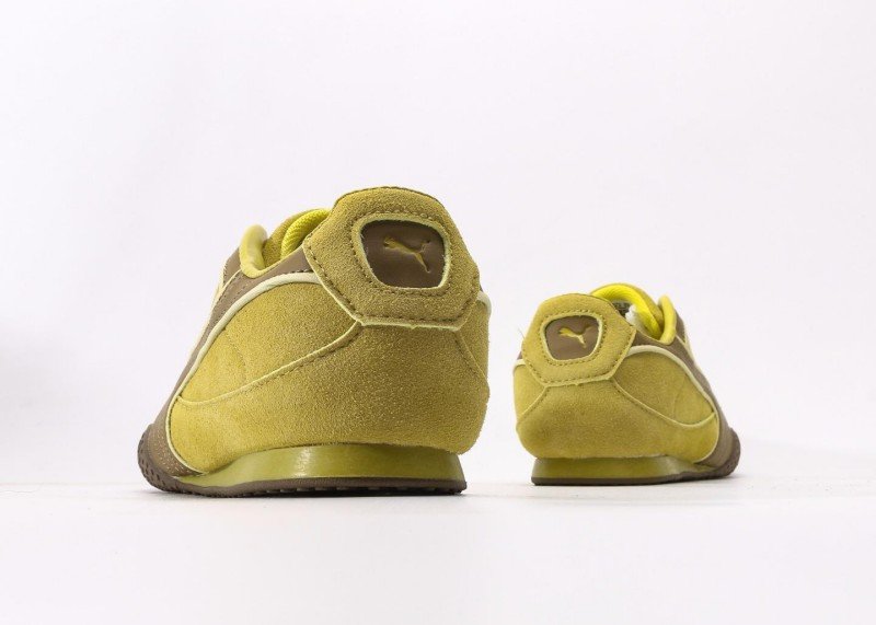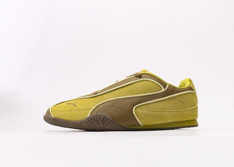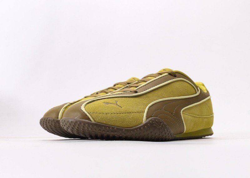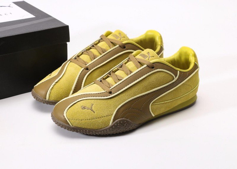 Rosé x PUMA Speedcat features yellow-brown-white colorblock, yellow suede upper with brown racing stripes, gold PUMA logo, dual lacing system, anti-slip rubber outsole, 1:1 official packaging.
