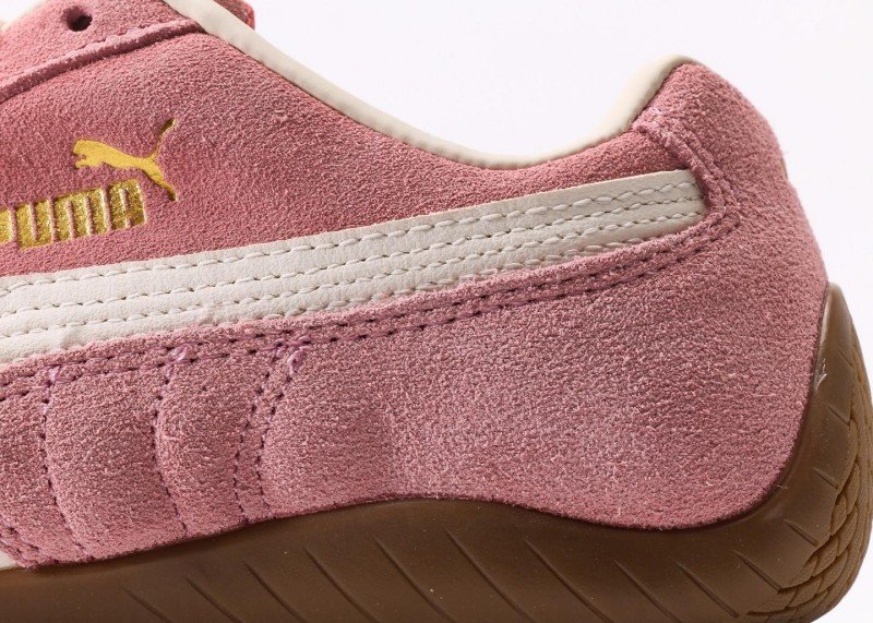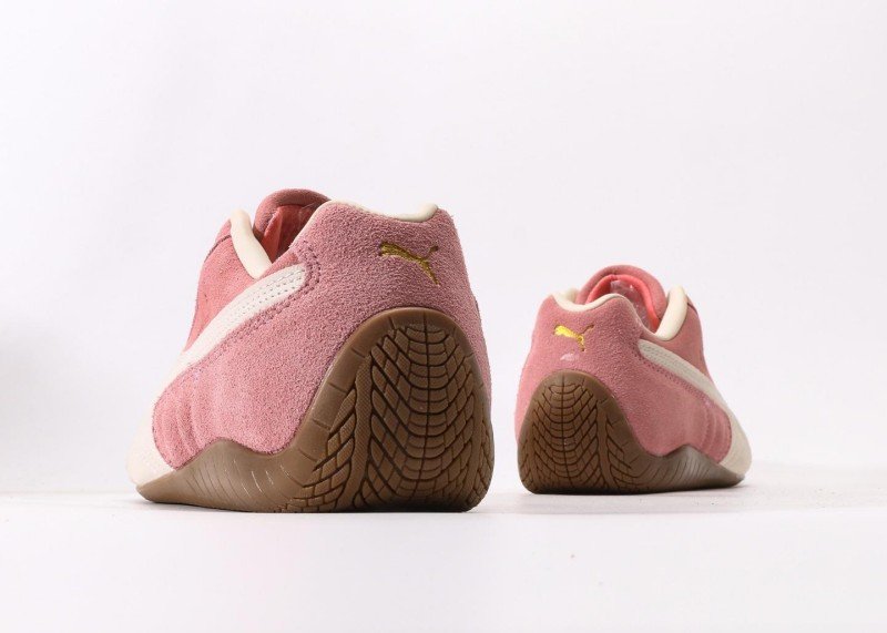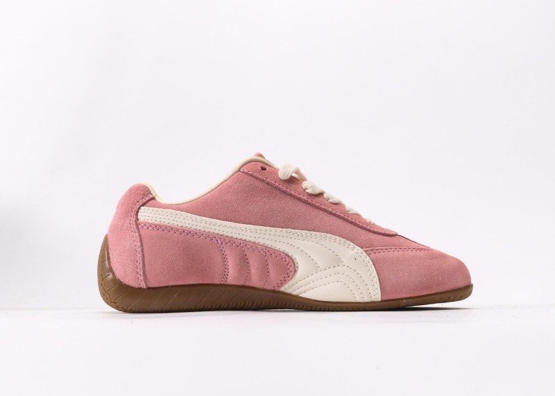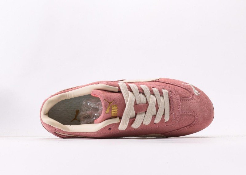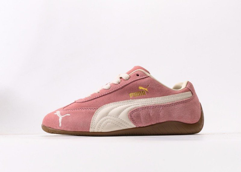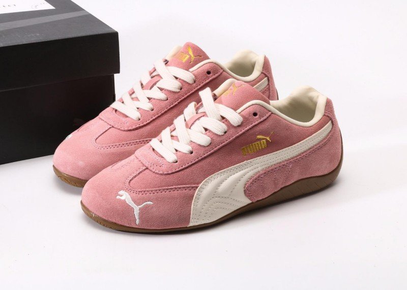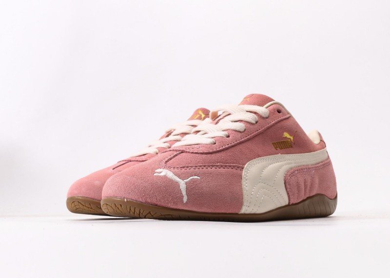 Rosé x PUMA Speedcat features pink-white-brown colorblock, pink suede upper with white racing stripes, gold PUMA logo, dual lacing system, anti-slip rubber outsole, 1:1 official packaging.