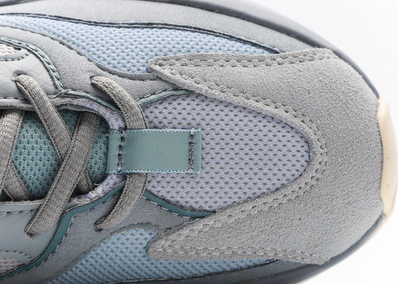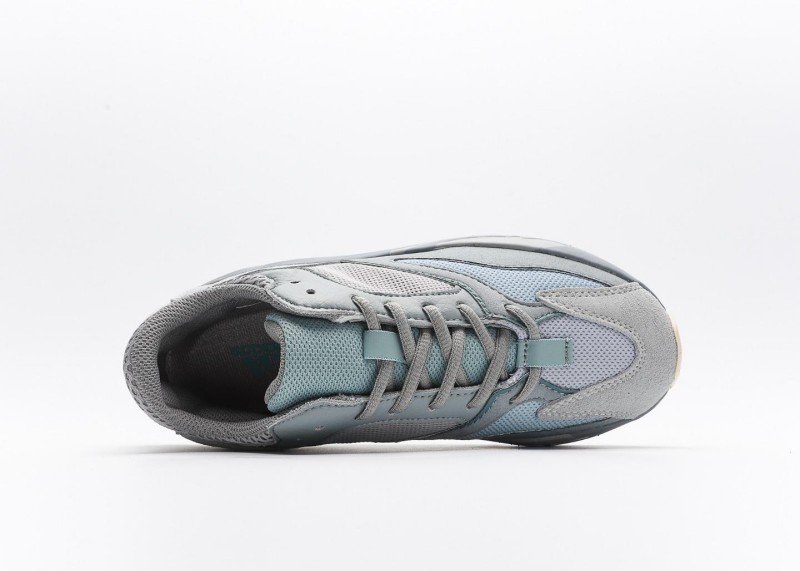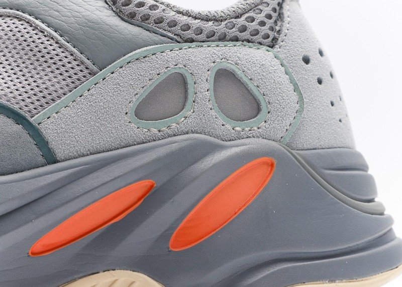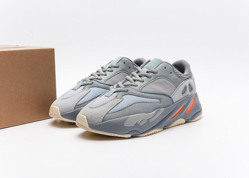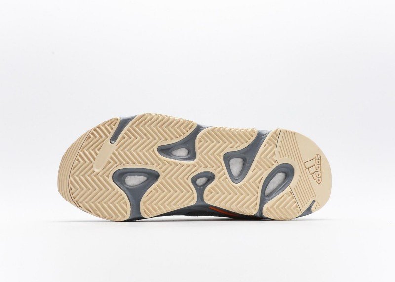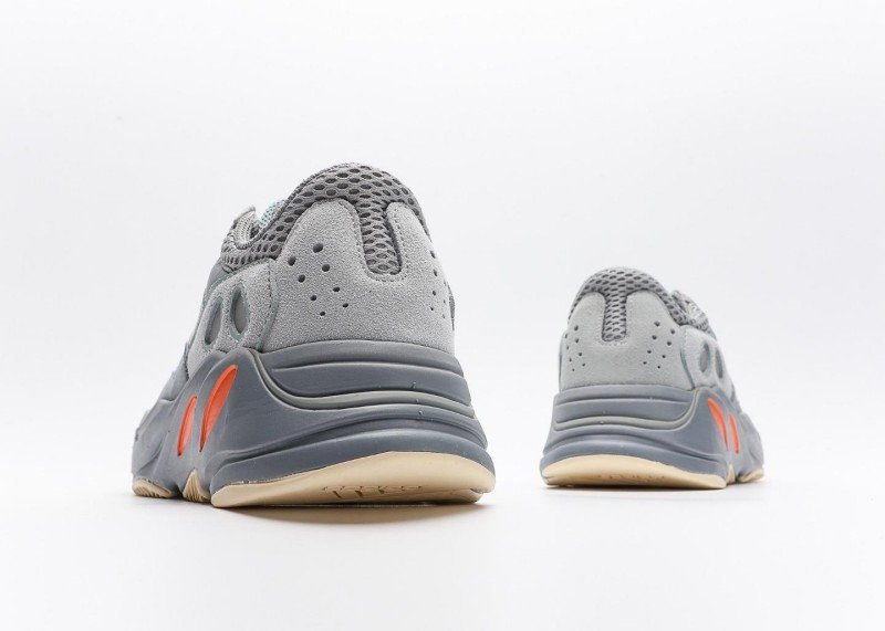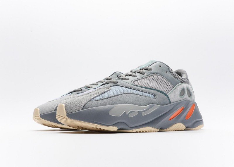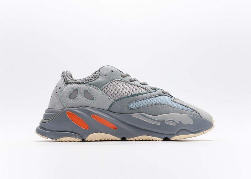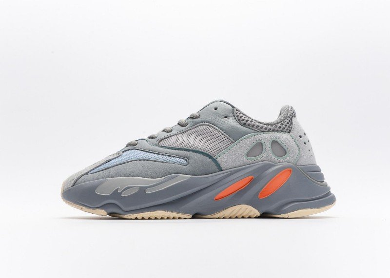 Yeezy Boost 700 V2 Grey Blue Orange Sneaker combines sport and fashion with grey-blue mesh, orange accents,透气孔, and grey-blue-white outsole for athletic-chic style.