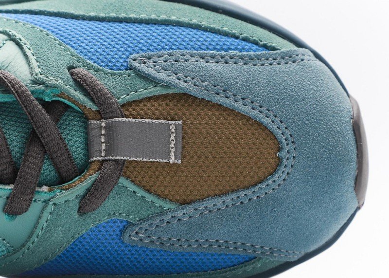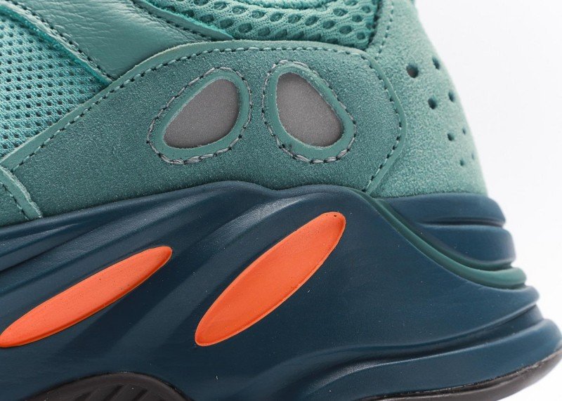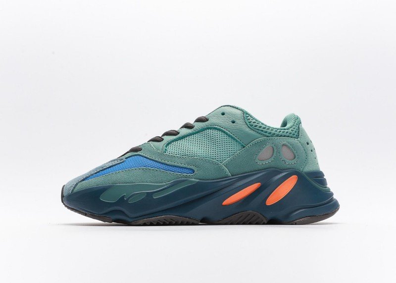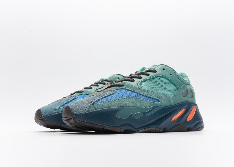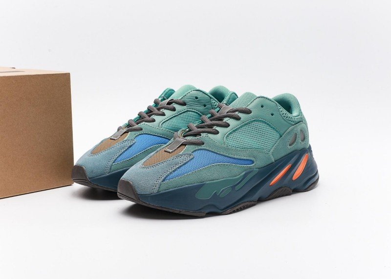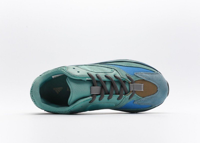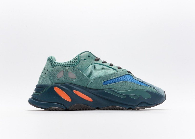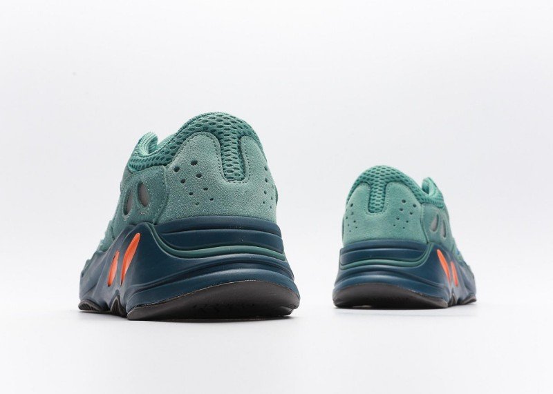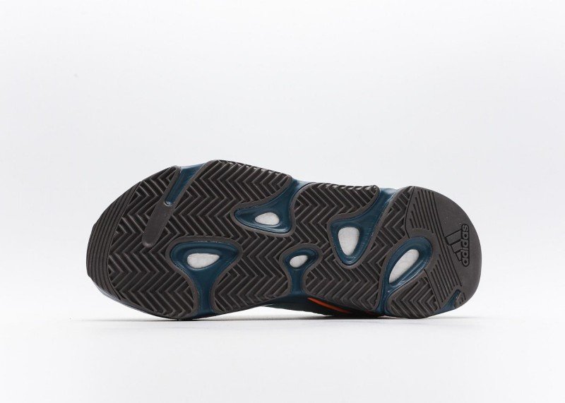 Yeezy Boost 700 V2 Teal Blue Orange Sneaker combines sport and fashion with teal mesh, blue accents,透气孔, and teal-orange outsole for athletic-chic style.