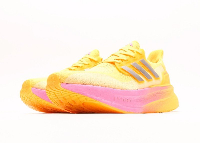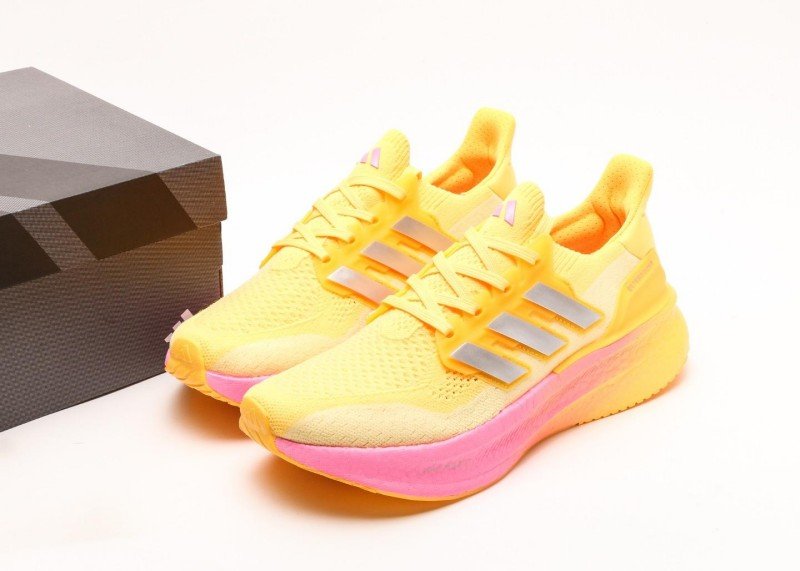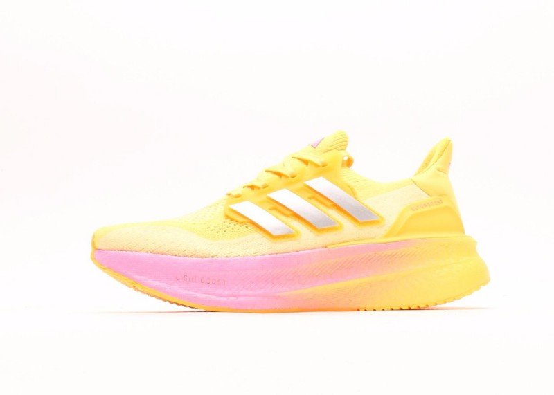 Yellow-Silver-Pink Gradient BOOST Sports Shoes feature a bright yellow base with silver stripes and pink-yellow gradient sole, classic three-stripe design upgraded, showing energetic sports style.